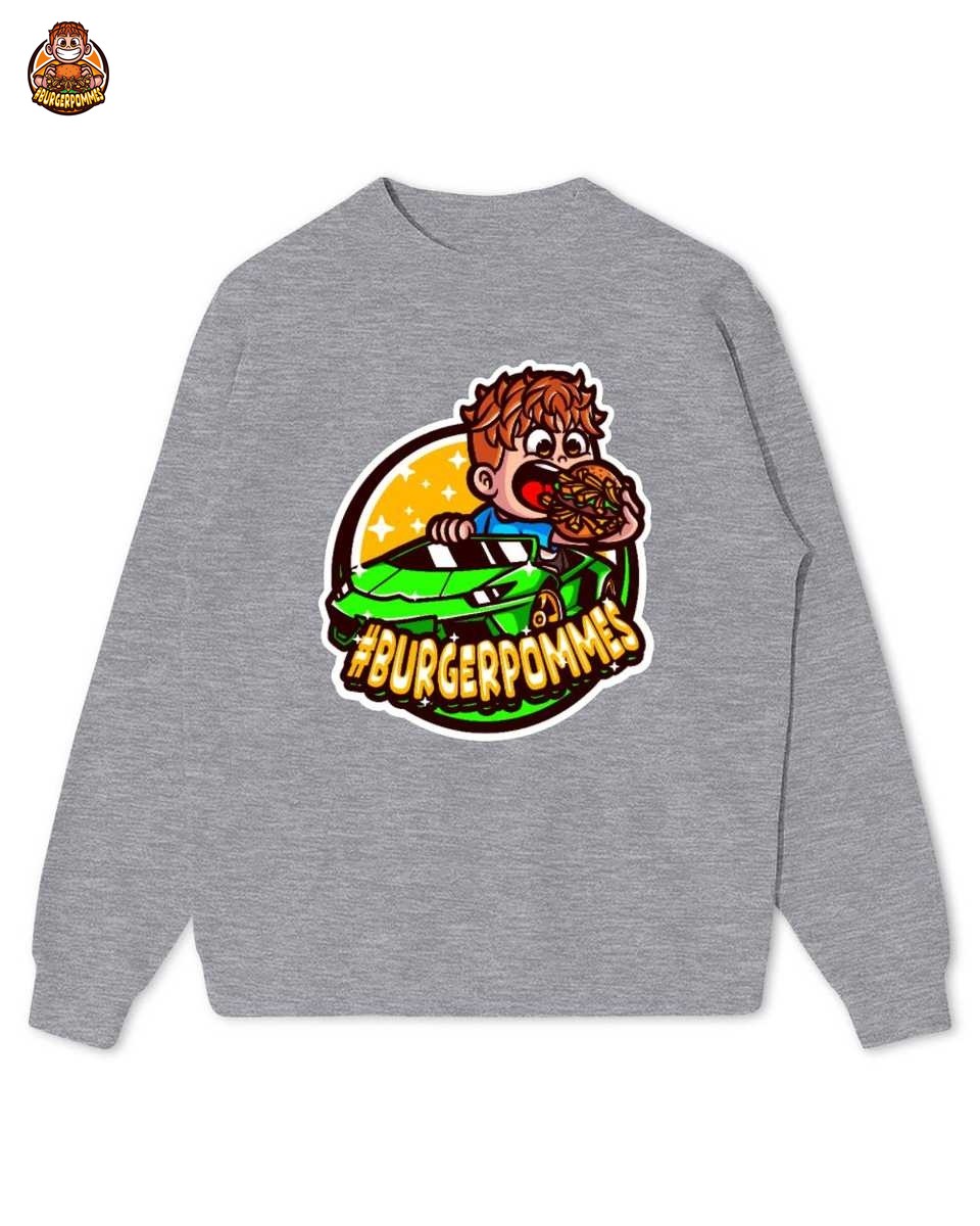 Das Artwork zeigt eine dynamische Comic-Illustration von Lukas in einem giftgrünen Sportwagen, während er genüsslich in einen riesigen Burger beißt. Mit dem auffälligen #BURGERPOMMES Schriftzug und leuchtenden Farben verkörpert das Design pure Energie, Humor und den unverkennbaren Lifestyle der erfolgreichen YouTube-Hits.