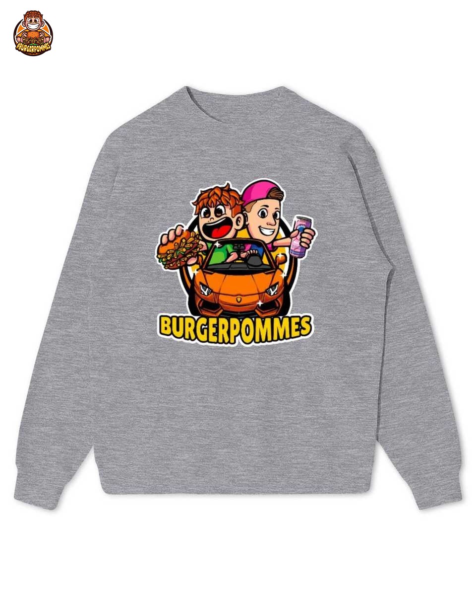 Das visuelle Konzept dieses Shirts ist ein echtes Meisterwerk für Fans. Im Zentrum steht ein detailreich gezeichneter oranger Supersportwagen, in dem die beiden YouTube-Stars sichtlich Spaß haben. Man sieht die Begeisterung in ihren Gesichtern – einer präsentiert stolz einen gigantischen, perfekt belegten Burger, während der andere mit einer stylischen Getränkedose anstößt. Kleine Details wie die funkelnden Sterne um das Auto verleihen dem Motiv einen Hauch von “High Life” und Erfolg. Der fette, gelbe Schriftzug “BURGERPOMMES” am unteren Rand sorgt für den sofortigen Wiedererkennungswert. Die Farben sind extrem kräftig und leuchten auf dem weißen Untergrund des Shirts, was für einen modernen und frischen Look sorgt, der sofort ins Auge sticht.